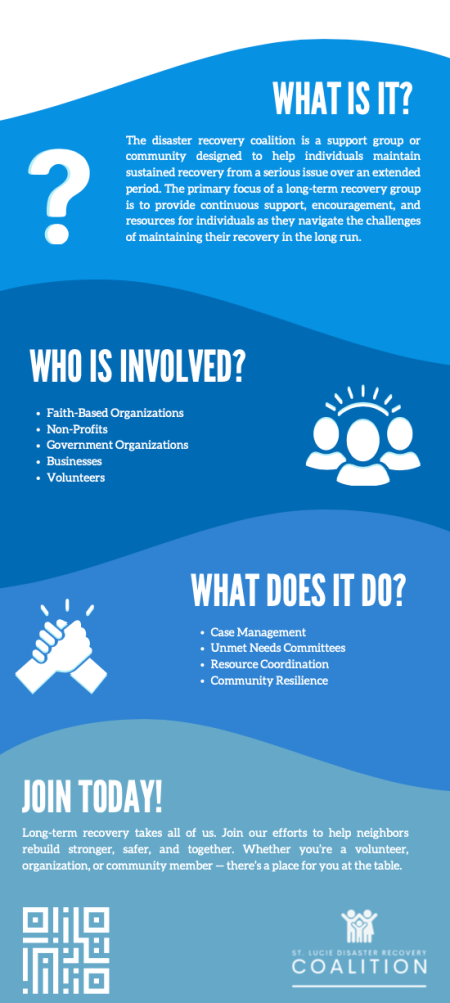The mission of the St. Lucie Disaster Recovery Coalition is to organize and strengthen long term recovery efforts for the unmet needs of residents affected by disasters in St. Lucie County.